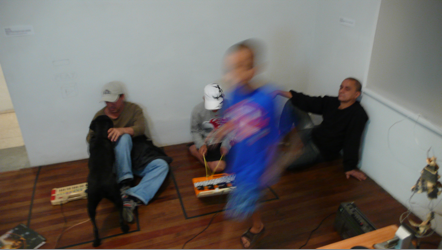Des essais de streaming analogue fait maison avec chiens. Une improvisation journalier entre le dehors et le dedans (de la maison) avec des objets sonores et jouets eléctroniques fabriqués par moi. De microphones fabriqués par moi aussi. C’était le son de la rue et le son qui vennait de chez le patio du voisin avec leur chiens (qui hurlaient et aboyaient à chaque fois qu’on sonnait chez eux, la sonnerie) ce son amplifié a l’intérieur de l’expo, et les improvisation musicaux avec les objets et le son de l’intérieur de la maison-galerie, on les envoyé chez les chiens avec un haut parleur vers le patio. L’intérieur vers l’extérieur, et à l’invers aussi.