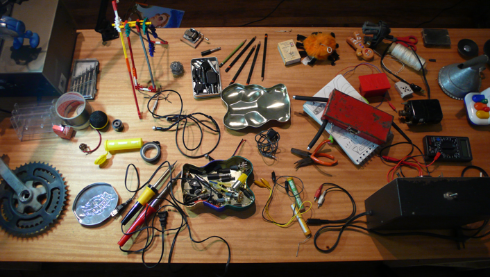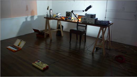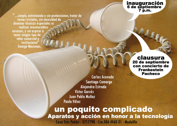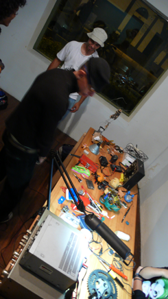 Il y a eu le dernier jour de l’exposition des enfants , des chiens, de gens du quartier qui ont participé en jouant tout les instruments-jouets. Le défi aussi c’était d’apprendre a brancher, souder, faire de bidouilles électroniques simples. Je ne pas touchée un ordinateur, l’idée c’était d’aborder la «technologie» de la manier plus fait maison. Lier avec des fil électriques des dessins sur les murs aux objets à piles. Alors, comme l’éxpo s’appelait «un poquito complicado», ça allait.