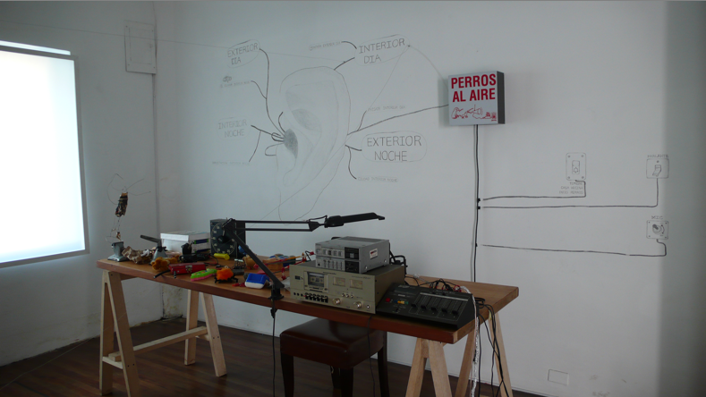 Amplificando y separando los planos sonoros de ese todo del «afuera» adentro de la casa, con los perros en primer plano, se montó todo un sistema de comunicación análogo con los perros. Así, el sonido del interior de la casa se amplificaba hacia el patio de los perros. Luego el jam session: música con instrumentos y objetos sonoros en la casa mezclados con la participación activa en vivo del aullar. Por supuesto, grabando el performance y enviándoles el monitoreo a los vecinos caninos.
