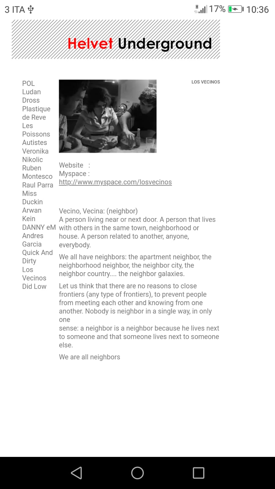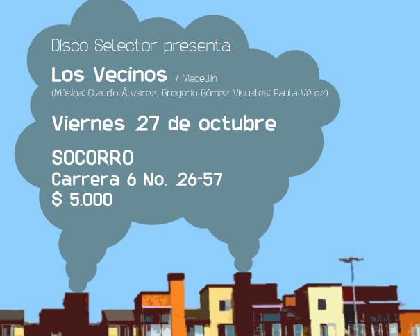 LOS VECINOS. Se perfilan como el live con mas proyección mundial del momento en Colombia. Su experiencia es un encuentro entre dos talentosos vecinos, que descarga una misteriosa mezcla entre el acid house, minimal techno y percusiones latinas. Acompañados de una visitante marciana programando secuencias de video… sin elevar mucho la velocidad, su live se convierte en una placentera experiencia para la pista de baile. www.myspace.com/losvecinos