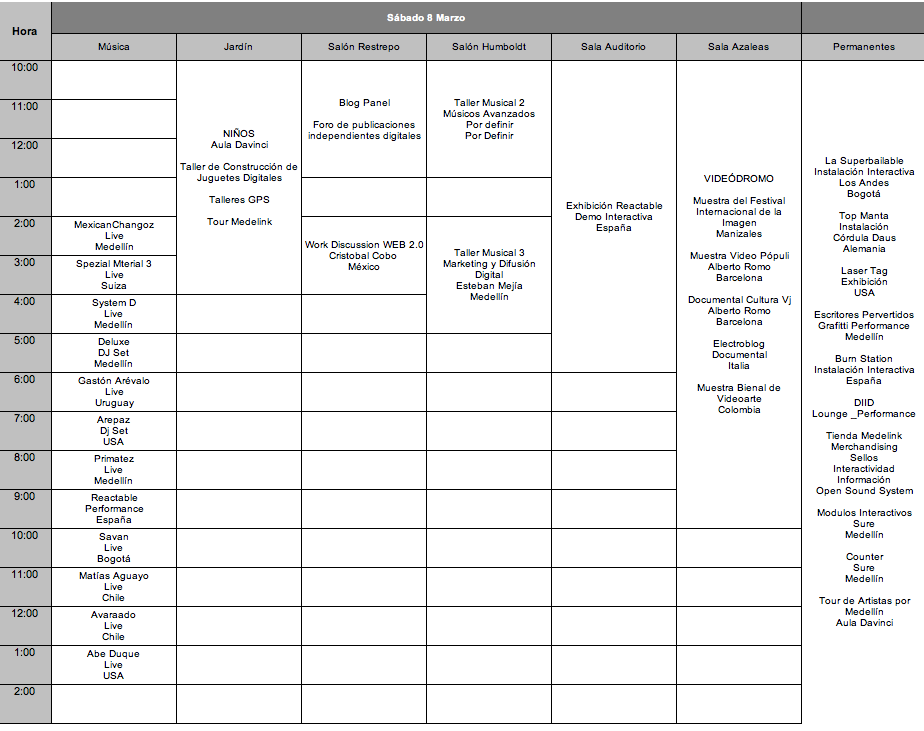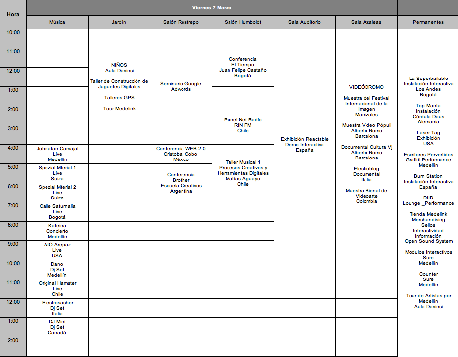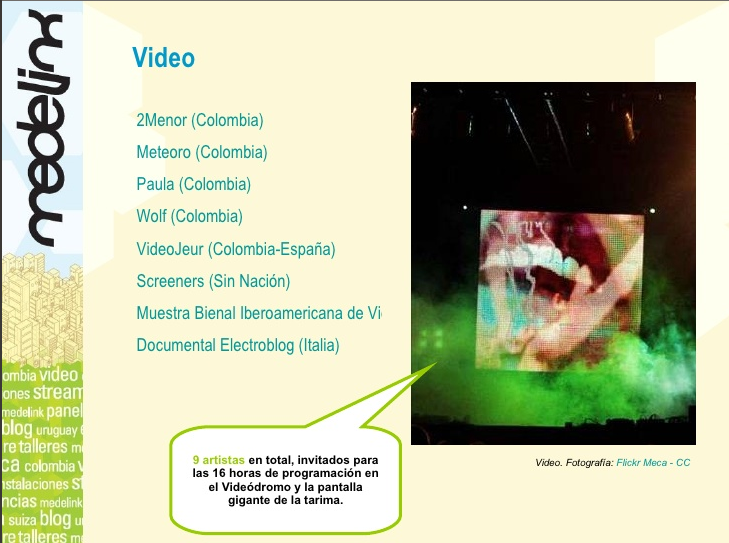 Artists: POL (Suiza) + Water Lilly (Suiza) + Los Mismos (Chile) + Rec_Overflow (España) + Marciano (Chile) + Líneas De Nazca (Mexico) + Dick el Demasiado (Holanda) + Lucrecia + Discosoye + Mami + Gino Vendetta + Dandy Head + Goes + Sano & Qk + Dj Toto + Los Vecinos + Bombaestéreo + Dani Boom + Protov, Medellin Wireless (Mde) + Altred (Mde) + Fuss!/Ambientador (Alemania / España) + Series Media (Mde) + Drap (Mde) + La Capsula (Bogota) + Burn Station (España) + Ninja Pingüino (Mde) + Manzanazeta (Mde) + Robot comics (Mde) + Discos Cocinados (Mde) + Joystick (España).