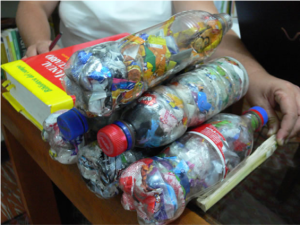 b) ¡OTRA ALTERNATIVA! El MINI relleno sanitario casero para usos , reutilización , convertir los ordinarios en material de construcción. Algunas personas están usando las botellas de PET (plásticas de gaseosa) para meter residuos ordinarios, material no reciclable como el papel de mecato, etc. Luego que se acumulan varias de estas botellas con los residuos comprimidos adentro, se donan a cualquiera de las obras que en varios lugares de Medellín, Envigado, La Estrella… se están haciendo con este material.