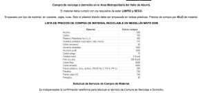 Aquí un cuadro de compra de reciclaje a domicilio en el Area Metropolitana del Valle de Aburrá. CLICK para ver la imagen grande y poder leer.