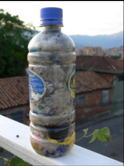 b) ¡OTRA ALTERNATIVA! El MINI relleno sanitario casero para usos , reutilización , convertir los ordinarios en material de construcción. Algunas personas están usando las botellas de PET (plásticas de gaseosa) para meter residuos ordinarios, material no reciclable como el papel de mecato, etc. Luego que se acumulan varias de estas botellas con los residuos comprimidos adentro, se donan a cualquiera de las obras que en varios lugares de Medellín, Envigado, La Estrella… se están haciendo con este material.