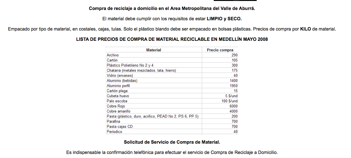 Aquí un cuadro de compra de reciclaje a domicilio en el Area Metropolitana del Valle de Aburrá. CLICK para ver la imagen grande y poder leer.