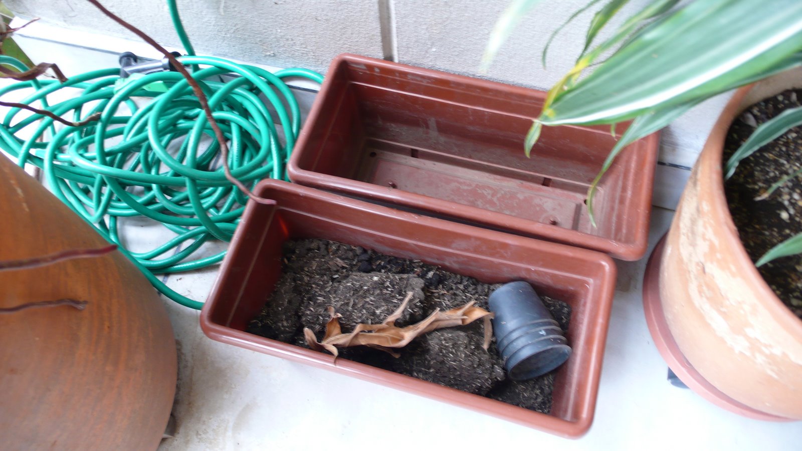Recipientes para el compostaje. Pero puede ser una sola caja plástica grande. Luego tocará llevar el compost, trasladarlo al jardín o a un lugar del edificio que dispongamos para este fin.