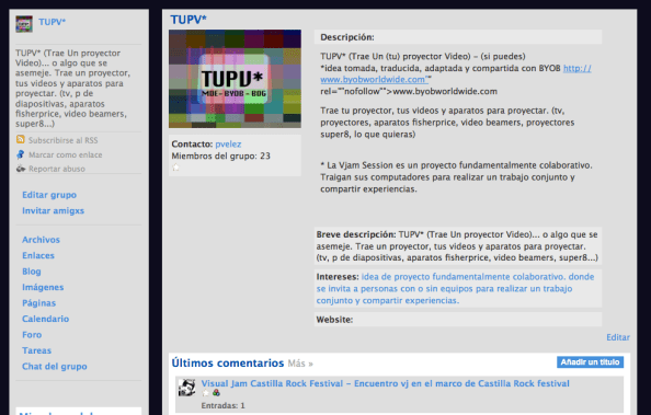 pvelez: March 17, 2011 10:11 Paula: hola, ojal� el entusiasmo no se acabe 14:26 FelipeW: esoo!!! March 22, 2011 0:01 Paula: hola 0:01 Paula: estaqs ahi? 0:01 Paula: que bien 0:01 Paula: pon� tus datos. 0:01 Paula: alpha suena muy bien 0:01 Paula: alphared 0:03 Paula: igual se ve raro. 0:03 Paula: ALFA 0:03 FelipeW: hola 0:03 Paula: hola 0:03 FelipeW: si, por aqu� leyendo, viendo cosas… anim�ndome a ver si propongo algo 0:04 Paula: solo me has escrito vos, julian, https://n-1.cc/pg/profile/julianb2x 0:05 Paula: y luis guillermo palacio. ? luispalaciosgiraldo@gmail.com 0:06 FelipeW: yo conozco otro por la novia, el fue, pero no recuerdo su nombre.. 0:06 FelipeW: tengo q preguntar para que aparezca 0:07 Paula: si, a ver si logramos un grupito. 0:07 Paula: para al menos tener un punto de referencia. 15:07 Paula: julian? 15:08 Paula: tenes ideas para un nombre? 15:08 Paula: para la red�? March 24, 2011 15:41 FelipeW: hasta que se arreglo esto 15:43 Luis Guillermo Palacios: jelow 15:47 Luis Guillermo Palacios: no hay nadie por aca? 15:51 FelipeW: hola 15:51 FelipeW: solo yo 15:51 FelipeW: en el momento 15:53 Luis Guillermo Palacios: que mas pues? 15:54 FelipeW: bien bien. aqu� echando ojo un rato 15:55 Luis Guillermo Palacios: yo estoy en las mismas 15:55 FelipeW: vas a ir el s�bado? tenes port�til? 15:55 Luis Guillermo Palacios: y con ganas de crear un perfil en esa red n-1 15:56 Luis Guillermo Palacios: sara me lo presta 15:56 FelipeW: ps, lo pregunto es que de pronto llevo proyector pero no tengo port�til ese d�a 15:56 Luis Guillermo Palacios: el mio ya esta muy viejo 15:56 FelipeW: a bien 15:59 FelipeW: listo, animo pal s�bado pues 15:59 FelipeW: me voy llendo 16:01 Luis Guillermo Palacios: de one nos pillamos pues 20:07 Luis Gmo Palacios G.: jelow 22:40 Luis Gmo Palacios G.: Hola a todos como va la causa? March 26, 2011 23:01 unnamed: alguien ac�? 23:10 Outsider: alguien? March 27, 2011 20:44 Luis Gmo Palacios G.: saludos a parche March 28, 2011 22:26 Paula: que nombre se le pone entonces? 22:26 Paula: �ltimos dias para la votacion y propuestas March 30, 2011 20:50 Outsider: alguien acA?? 20:50 Outsider: hasta cu�ndo hay plazo para proponer nombres Paula? April 27, 2011 12:15 Paula: deber�amos ponerle l�mite. 12:15 Paula: pero toca hacer votaci�n. 12:15 Paula: por cual votas outsider? 12:50 unnamed: para mi el nombre es lo de menos, reunirnos y emprzar a trabajar es lo importante 12:50 b2x: ese era yo, jeje April 28, 2011 13:03 Paula: hola 13:03 Paula: b2x 13:03 Paula: que m�s? 13:04 Paula: que tal si le seguimos llamando TUPV* 13:04 Paula: as� toma la forma de un grupo, evento, cosa abierta que vaya quien quiera. 13:05 Paula: as� tambi�n queda como algo sin nacionalidad. 13:05 Paula: solo un parche para hacer jugarretas con todo lo que se proyecte 22:48 b2x: me gusta 22:49 b2x: y bacano q es algo medio abstracto May 2, 2011 23:43 unnamed: como va todo? May 3, 2011 0:21 b2x: hey entonces quedamos jueves 4pm en casa tres patios May 4, 2011 0:28 melaganodeojo: entonces caul jueves? 19:25 b2x: el 12