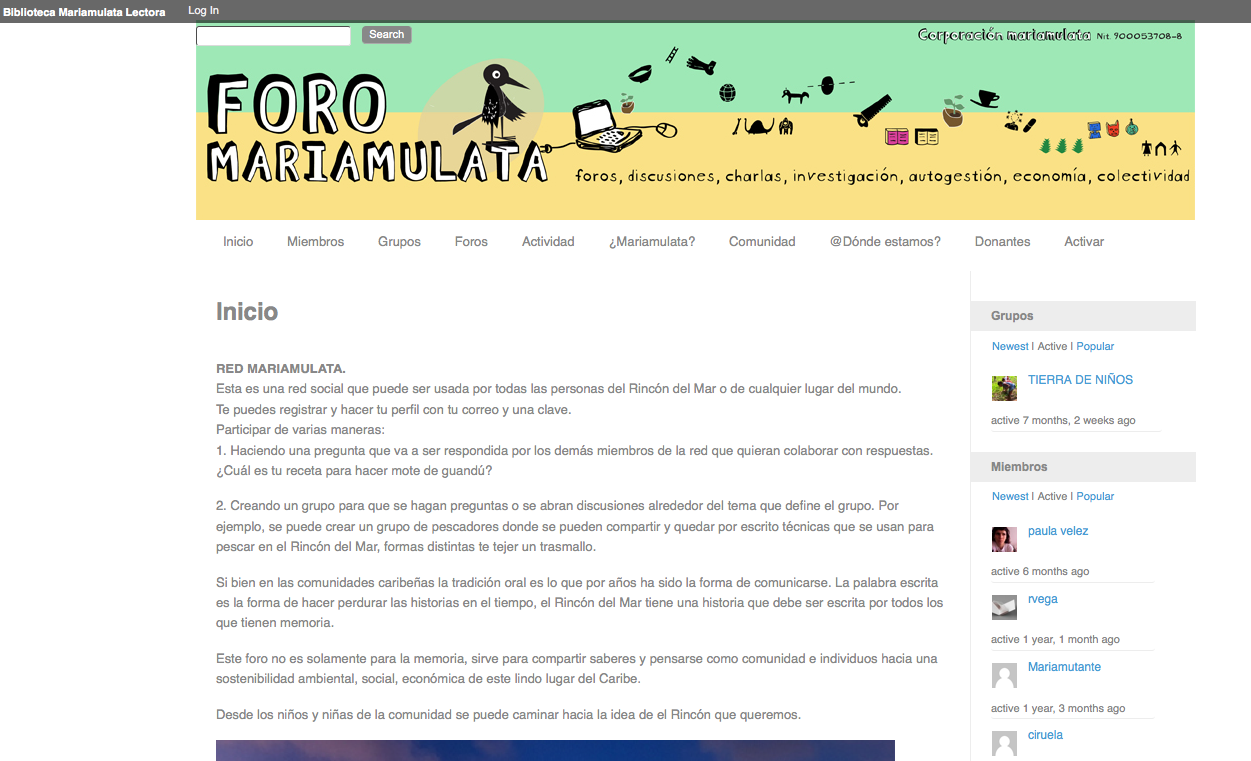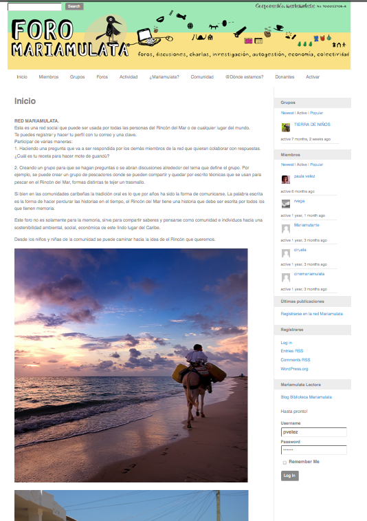 Concibiendo y trabajando con la ayuda y asesoría de Rafael Vega quien nos prestó su dominio y servidor. Montamos un Foro con la idea de fabricar una alternativa de red para el Rincón del Mar usando el servicio, servidores y equipos de la Mariamulata. La página está en BETA todavía no despega.
