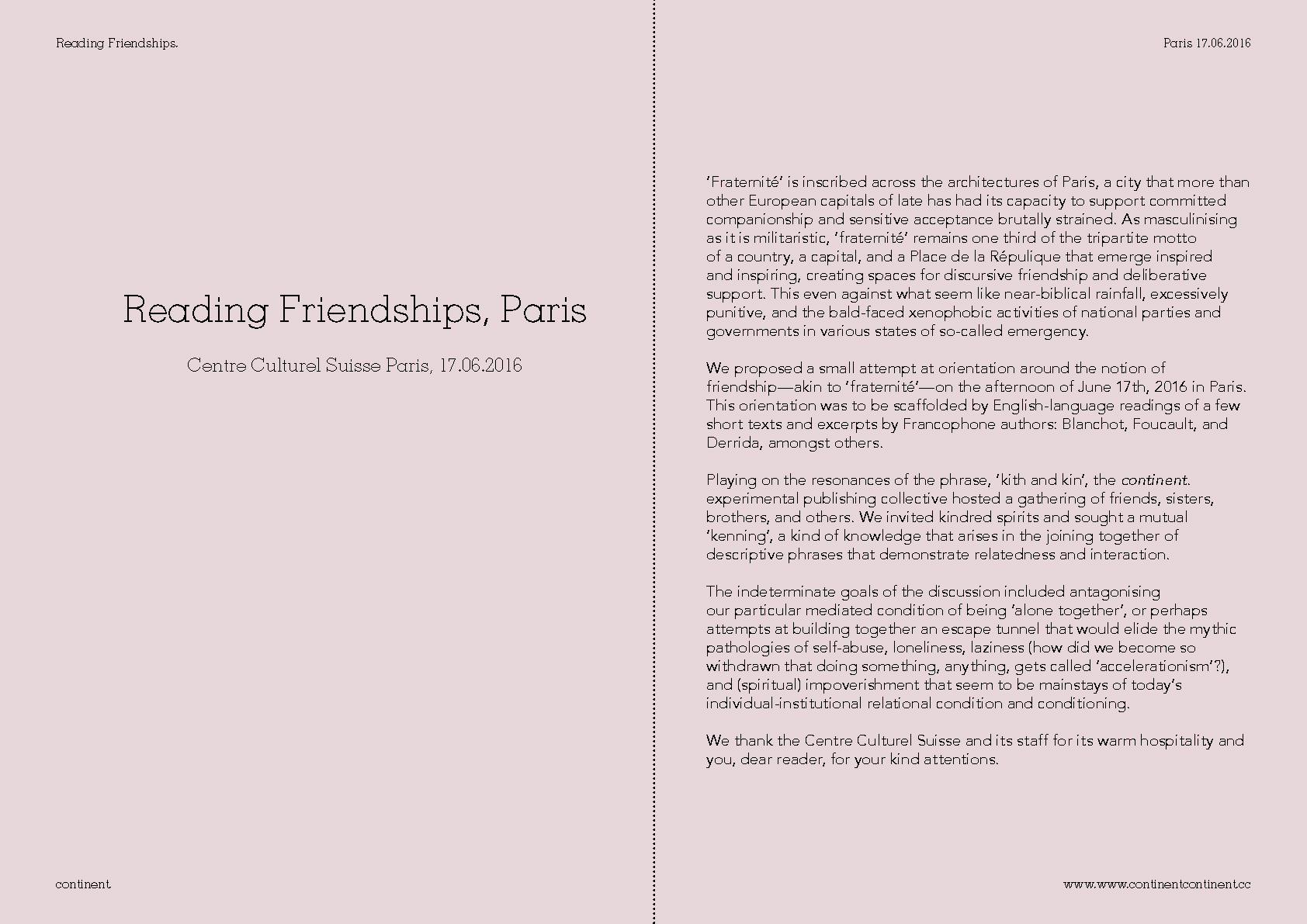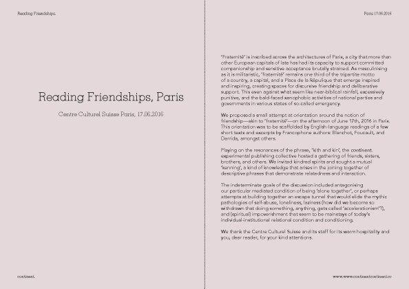 We propose a small attempt at orienting ourselves around notions of friendship—akin to ‘fraternité’—on the afternoon of June 17th in Paris. We will be orienteered by English-language readings of three short texts excerpts by Francophone authors: Blanchot, Foucault, and Derrida.