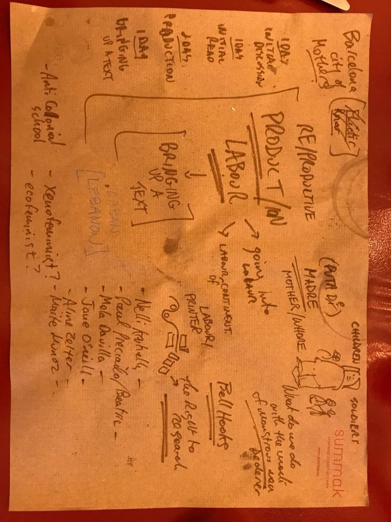 tuvimos circulando muchas palabras en nuestras conversa- ciones en tres idiomas como: care, sobreprotección, aten- ción, friendship, guilt, labour, violencia obstétrica, domestic civil war, (re)production, invisibility, play, seeds, intersectio- nality, (m)other, pro(duction), pro(geny), pro(tect), pro(ject), against, childish, politicization of maternity… La percepción de las palabras de las que hablamos, cada una la entendía- mos desde diferentes lugares.