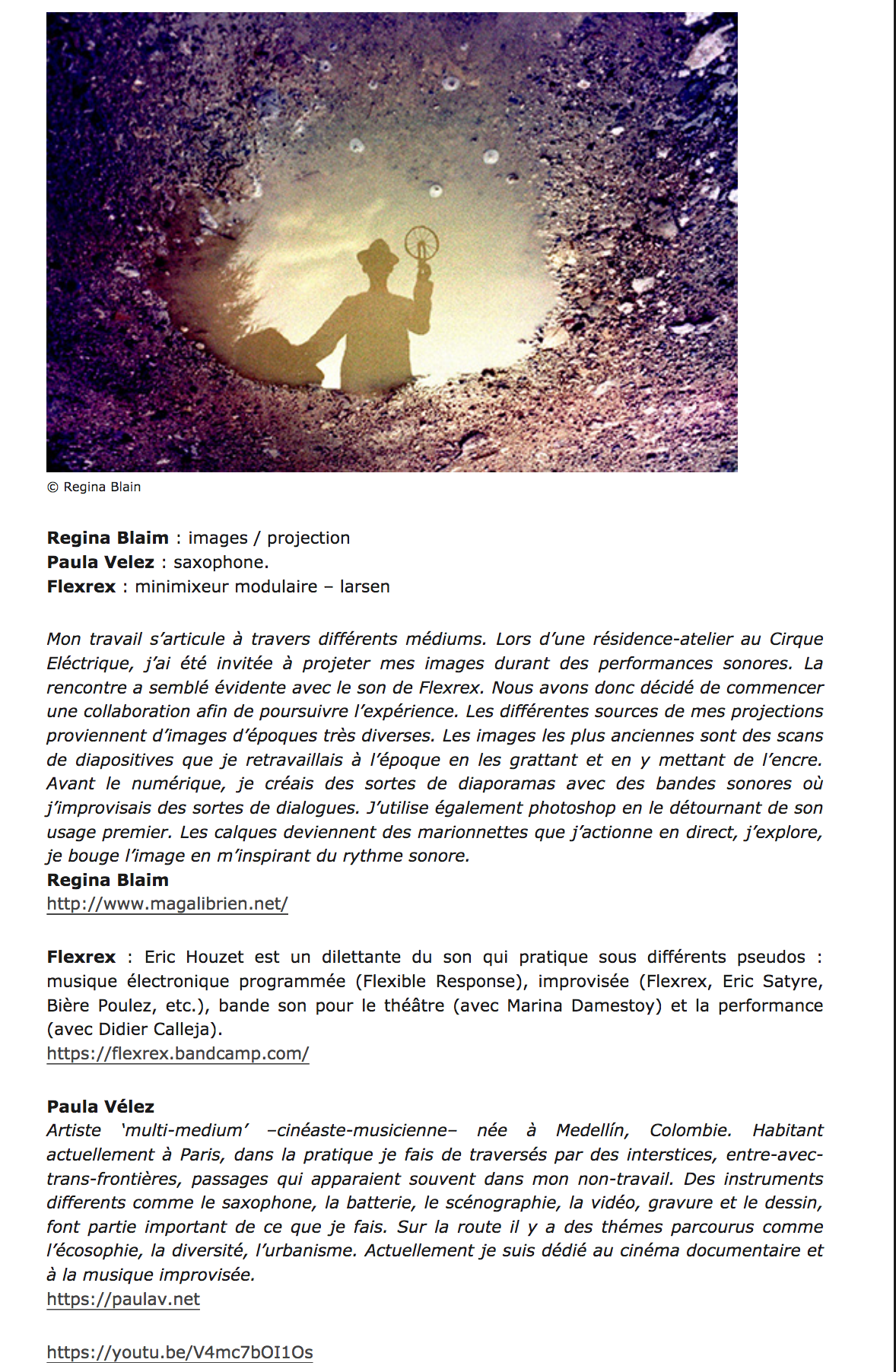 Flexrex : Eric Houzet est un dilettante du son qui pratique sous différents pseudos : musique électronique programmée (Flexible Response), improvisée (Flexrex, Eric Satyre, Bière Poulez, etc.), bande son pour le théâtre (avec Marina Damestoy) et la performance (avec Didier Calleja).