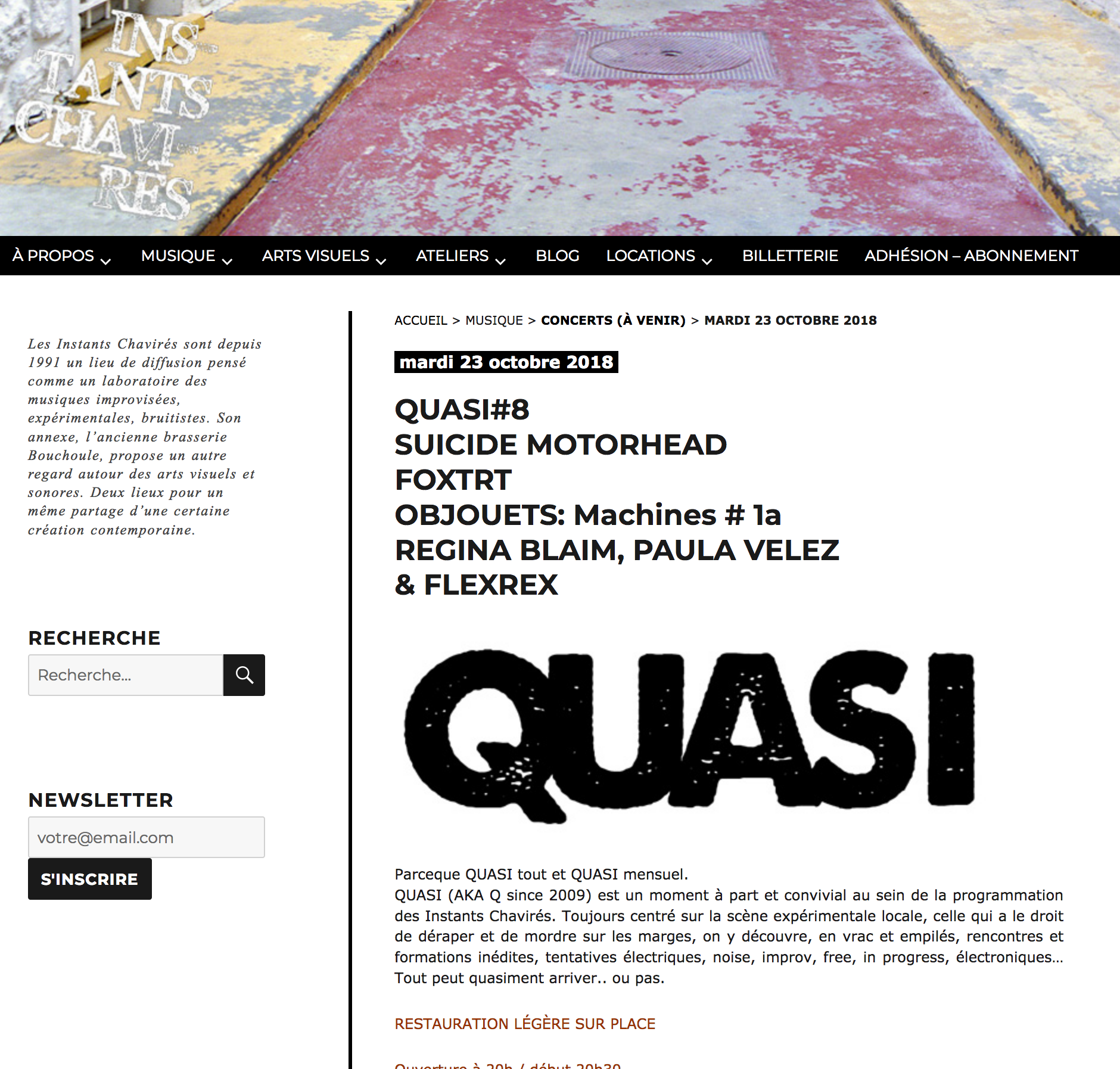 QUASI (AKA Q since 2009) est un moment à part et convivial au sein de la programmation des Instants Chavirés. Toujours centré sur la scène expérimentale locale, celle qui a le droit de déraper et de mordre sur les marges, on y découvre, en vrac et empilés, rencontres et formations inédites, tentatives électriques, noise, improv, free, in progress, électroniques… Tout peut quasiment arriver.. ou pas.