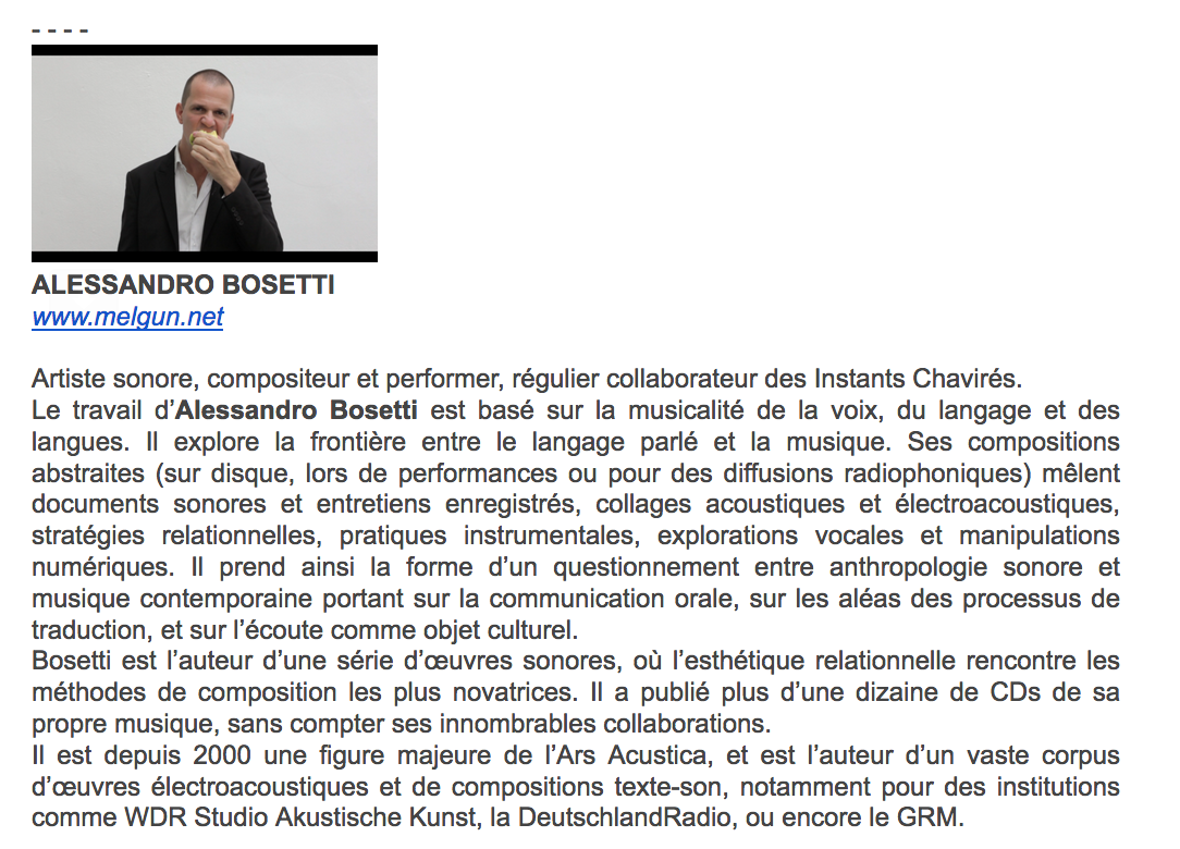 Les sons des voix et des instruments des participants seront au même niveau de propositions sonores radiophoniques, électroacoustiques et musicales proposés et structurés par Alessandro Bosetti.