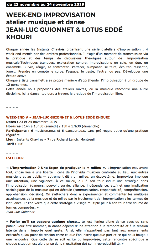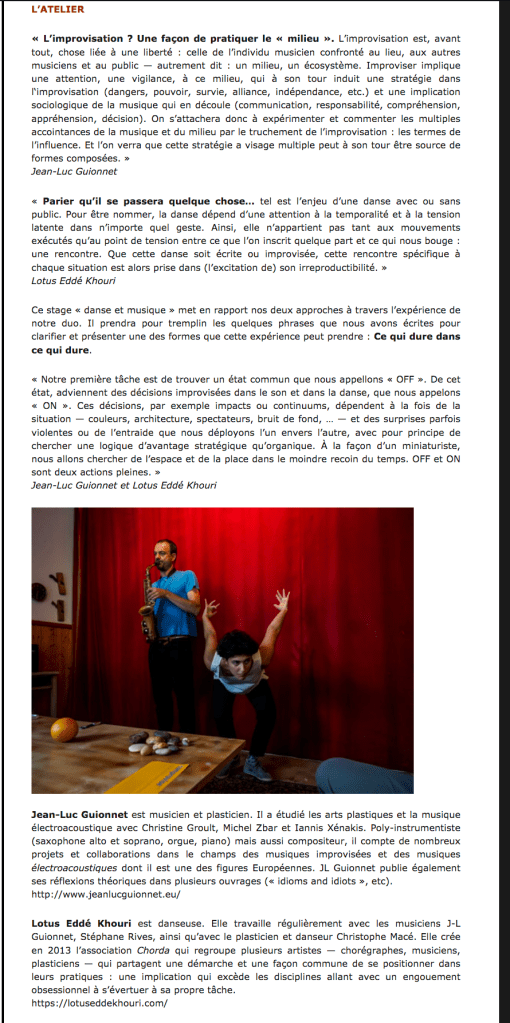 Comme à chaque fois que j’ai eu la chance de participer à des ateliers, cette fois-ci, avec Jean-Luc Guionnet et Lotus Eddée Khouri, le weekend a été très inspirant, beaucoup des questions ouvertes à poursuivre en musique et corps.