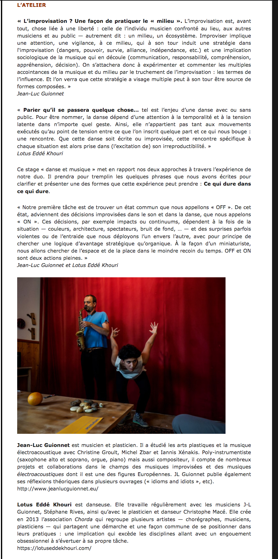 Comme à chaque fois que j’ai eu la chance de participer à des ateliers, cette fois-ci, avec Jean-Luc Guionnet et Lotus Eddée Khouri, le weekend a été très inspirant, beaucoup des questions ouvertes à poursuivre en musique et corps.