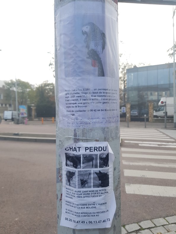 Sur la route je trouve un perroquet et un chat perdu. À mon avis les deux se sont libérés et retrouvés en liberté. Iels se sont mis d’accord.